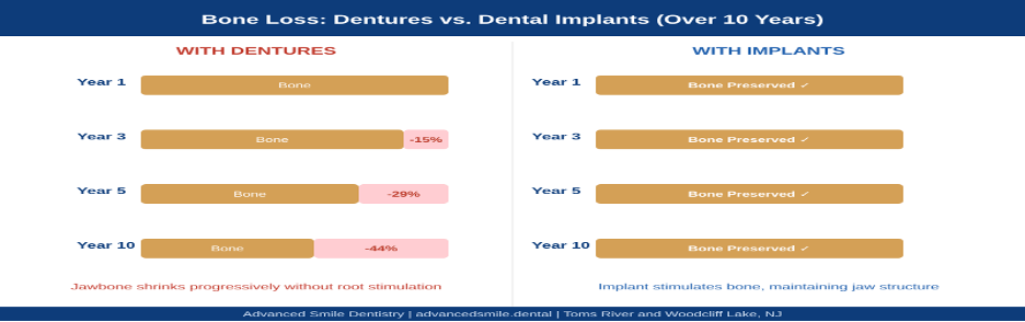 One of the most important differences between dentures and implants is often invisible to patients until it is too late to address without significant intervention. Without a tooth root stimulating the jawbone, bone resorption begins within the first year of tooth loss. Conventional dentures do not stop this process.