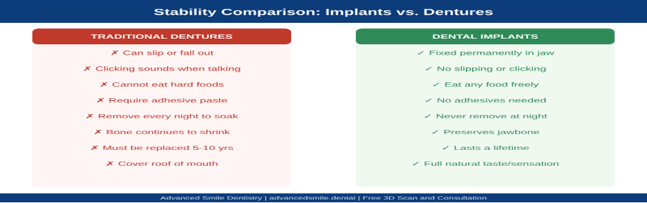 Fig. 2 — Stability comparison: what dental implants offer vs. what traditional dentures cannot