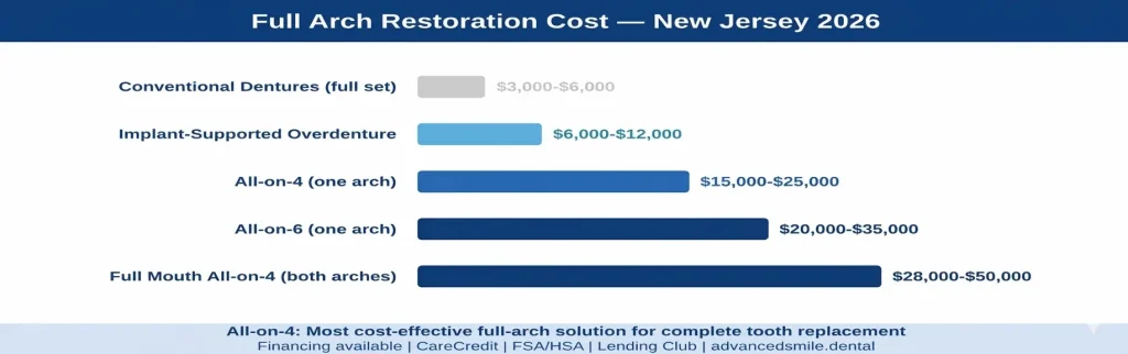 Fig. 2 — Full arch restoration cost comparison: NJ 2026 market ranges