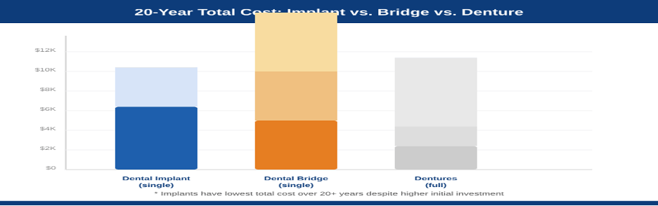 When accounting for replacement cycles and potential bone loss complications, dental implants frequently represent the more cost-effective solution over a 10 to 20 year horizon, despite their higher initial investment.