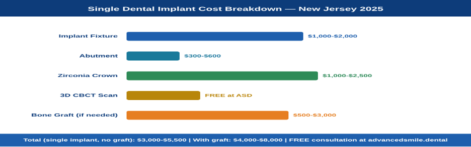 The total cost of a single dental implant in New Jersey, including the implant fixture, abutment, and crown, typically ranges from $3,000 to $5,500. This is comparable to the national average of $3,000 to $6,000 reported by the American Dental Association Health Policy Institute.